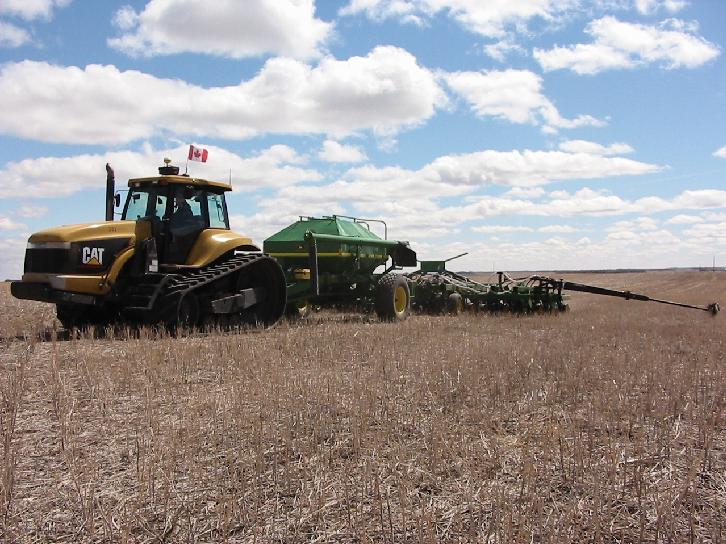 Au printemps nous nous sommes trouvés très occupés. Nous avions juste repris 650 ha au sud de Edgeley. Il y avait beaucoup a organiser en dernière minute. Au niveau matériel nous avons vendu notre JD 4955 et nous avons acheté un Caterpillar Challenger 45 a chenilles. Je voulais trouver plus d' adhérence, et j' ai été servi. J'étais assez nerveux a l' idée d' être tout seul devant une montagne de travail avec 1350 ha a semer, avec personne pour m' aider. Dans ma recherche j' ai trouvé Less McGregor qui se trouvait au chômage technique jusqu' au mois de Mai; juste bien. Quand la neige a totalement fondu, nous avons commencé a passer la herse sur la nouvelle ferme sur les chaumes de blé pour mieux éparpiller la paille.
