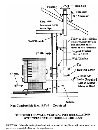 The Countryside grain burning stove can be vented directly through a wall just like the drawing here-under. An outside supply of combustion air is needed and the exhaust is vented out through a double wall insulated stainless steel pipe specially designed for grain burning For complete installation instructions refer to the owner's manual We are able to supply you with all the venting necessary to a proper installation. We recoment Simpson Duravent exhaust venting |